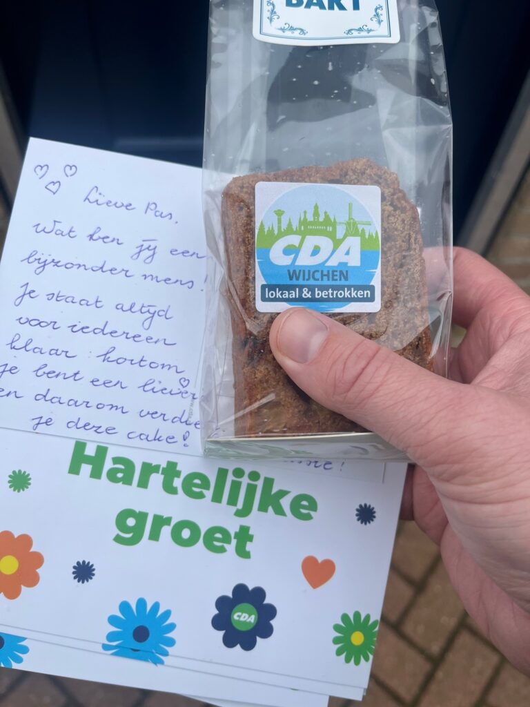 Bea bracht samen met anderen van het CDA Wijchen de baksels persoonlijk rond. Zij blikt hier op terug: “Het was heel mooi om te zien hoe aangenaam verrast de betreffende bewoners reageerden. We zijn kriskras door Wijchen en de dorpen gegaan om bijvoorbeeld inwoners die moeilijke tijden beleven een steuntje in de rug te geven of gewoon een bedankje over te brengen. Het is extra speciaal als er dan een kaartje bij zit van de bekenden die hen hiervoor opgegeven hebben. Dat is omzien naar elkaar en dat vind ik mooi”, aldus Schouten.